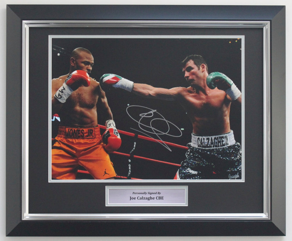 JOE CALZAGHE PERSONALLY SIGNED & FRAMED PHOTOGRAPH FIGHTING ROY JONES Jr in 2008 PLM582-SPF1