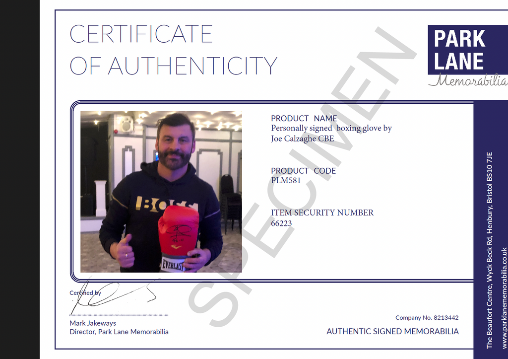 Signed in person by Calzaghe at a Park Lane Memorabilia signing event, this glove captures a piece of boxing greatness from one of the sport’s most respected champions. Ideal for collectors, fans, or display in a sports-themed room, gym, or office, it represents both historic achievement and lasting legacy.