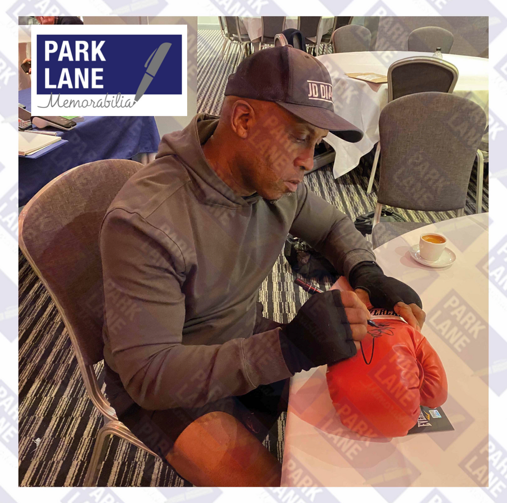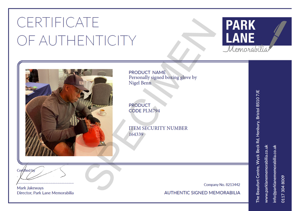 This item was personally signed by Nigel Benn at a Park Lane Memorabilia event in Swindon, making it a standout collectible for boxing fans and memorabilia collectors alike.