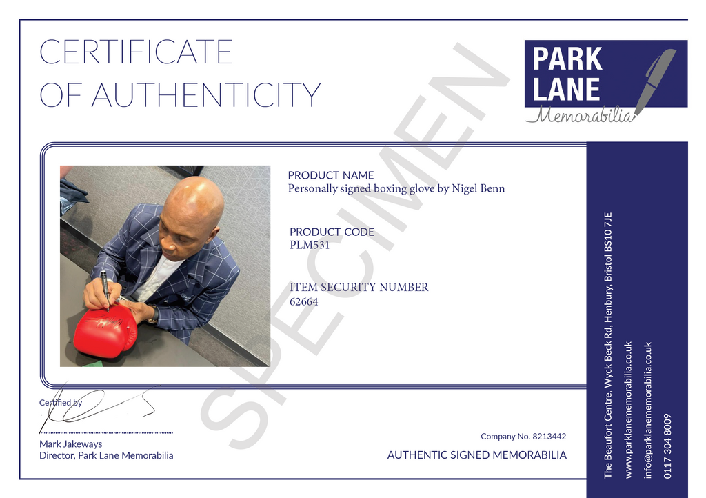 This item was personally signed by Nigel Benn at a Park Lane Memorabilia event in Swindon, making it a standout collectible for boxing fans and memorabilia collectors alike.
