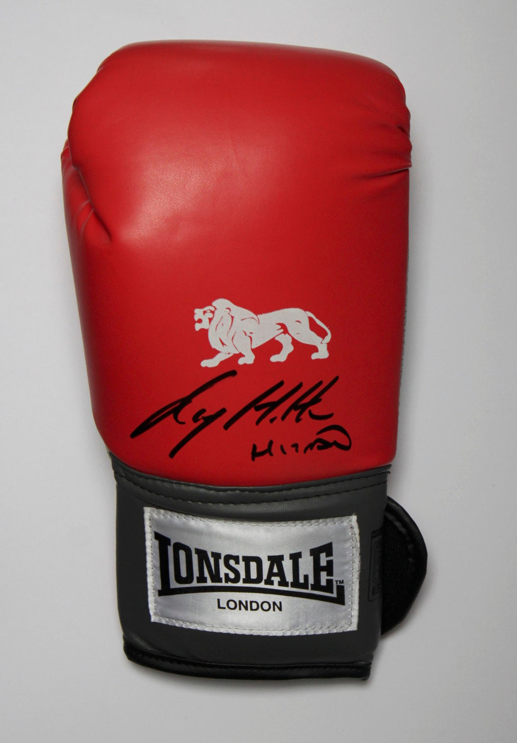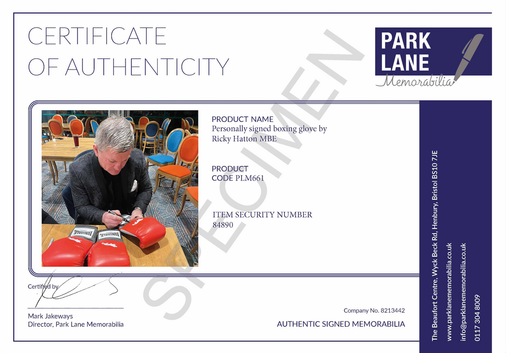 Boxing glove personally signed by Ricky Hatton, He is a two-time IBF and IBO light welterweight champion and the former WBU, WBA Light Welterweight Champion and WBC, WBA, WBO Inter-Continental Light Welterweight Champion.
