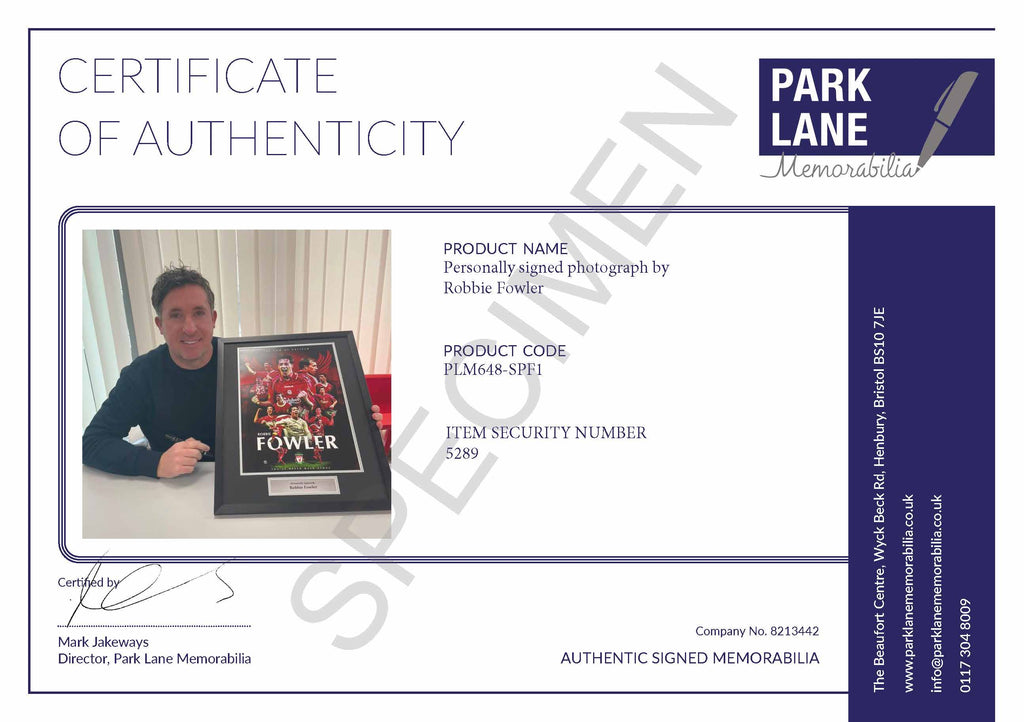 This stunning montage of iconic photographs has been exclusively designed for Park Lane Memorabilia and personally hand-signed by Liverpool legend Robbie Fowler during a private signing session in Liverpool.