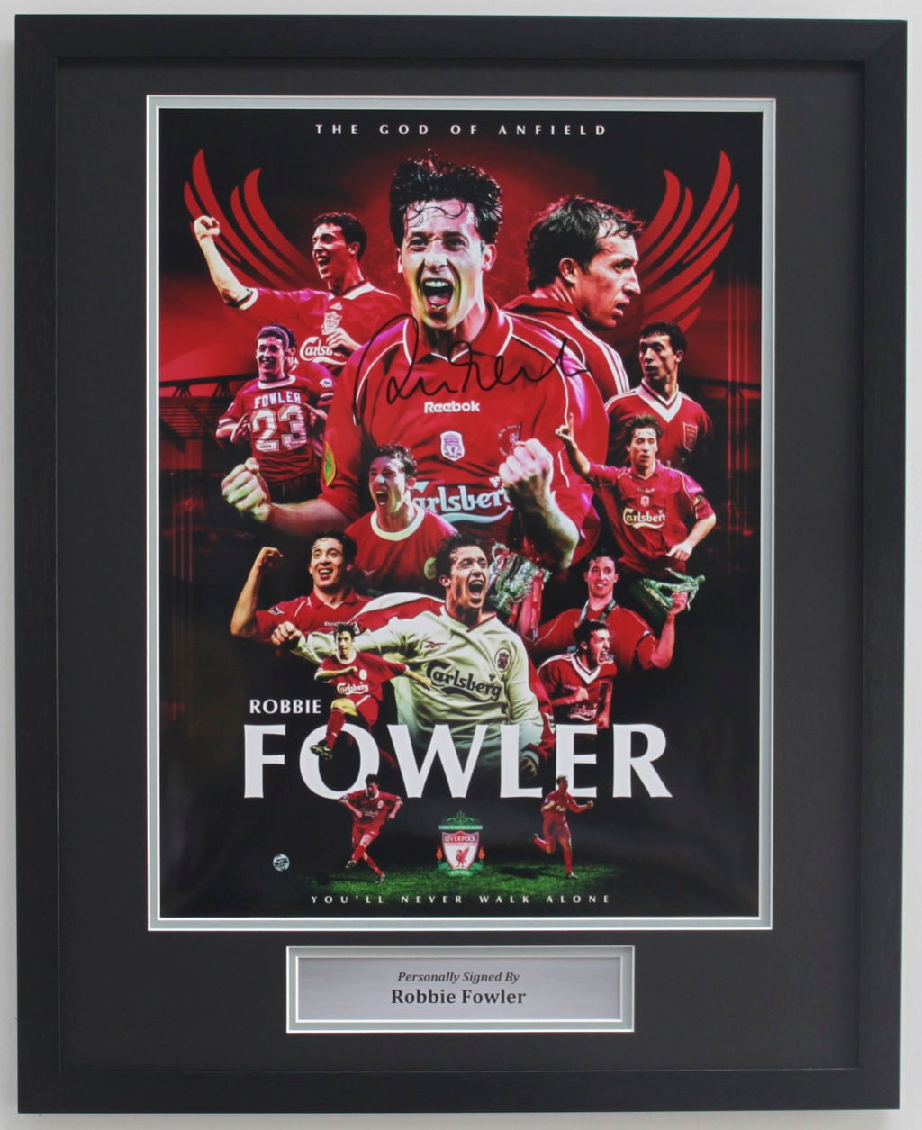 This stunning montage of iconic photographs has been exclusively designed for Park Lane Memorabilia and personally hand-signed by Liverpool legend Robbie Fowler during a private signing session in Liverpool.