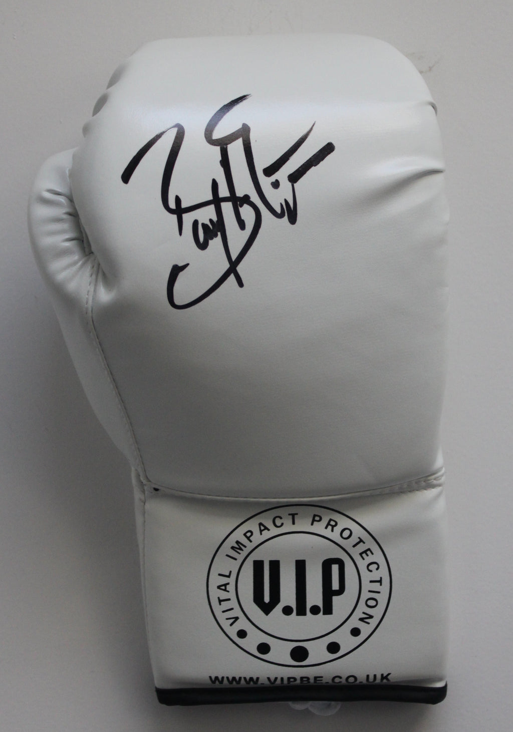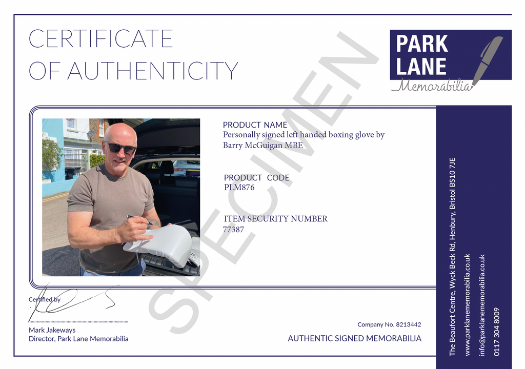 Boxing glove personally signed by Barry "The Clones Cyclone" McGuigan, McGuigan is renowned for his reign as WBA and lineal featherweight champion from 1985 to 1986, as well as his British and European featherweight titles held between 1983 and 1985. A prized piece for serious collectors, this signed glove represents a significant era in boxing history.