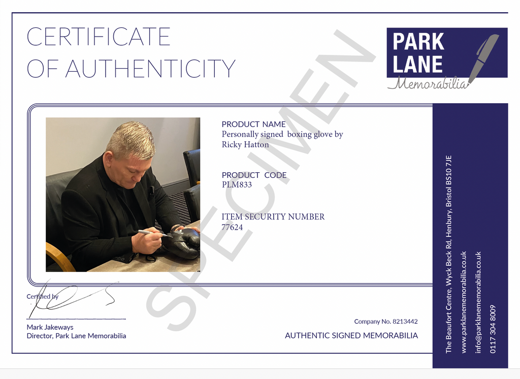 Boxing glove personally signed by Ricky Hatton, Ricky a two-time IBF and IBO light welterweight champion and the former WBU, WBA Light Welterweight Champion and WBC, WBA, WBO Inter-Continental Light Welterweight Champion.