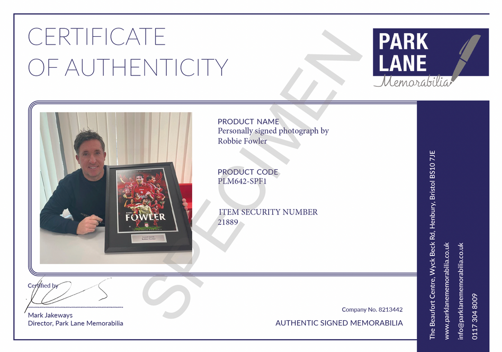 This stunning montage of iconic photographs has been exclusively designed and personally hand-signed by Liverpool legend Robbie Fowler during a private signing session in Liverpool.