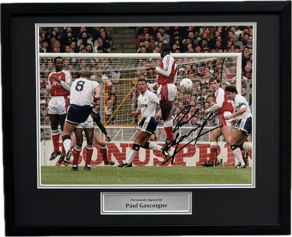 This stunning Paul Gascoigne signed photograph captures Gazza scoring against Arsenal in the 1991 FA Cup semi-final — a thunderous strike that remains one of the most iconic goals in FA Cup history.